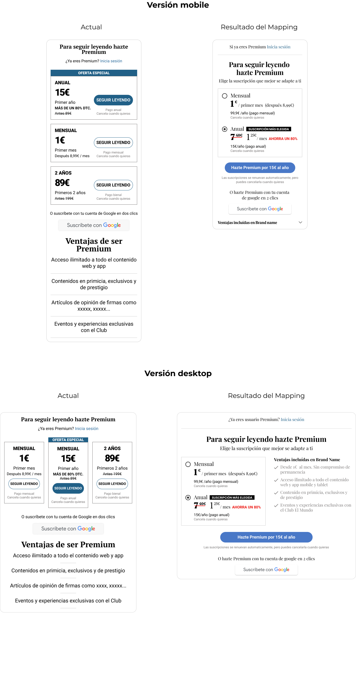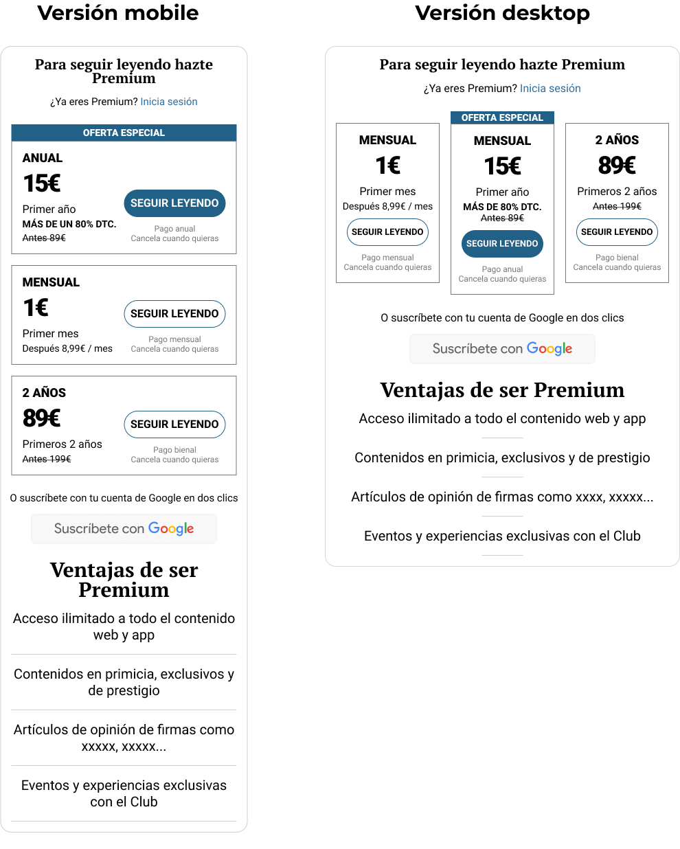 En el diseño actual del paywall para las versiones web móvil y web de escritorio, se identificaron los elementos que necesitaban mejoras: