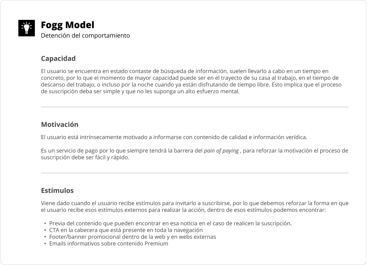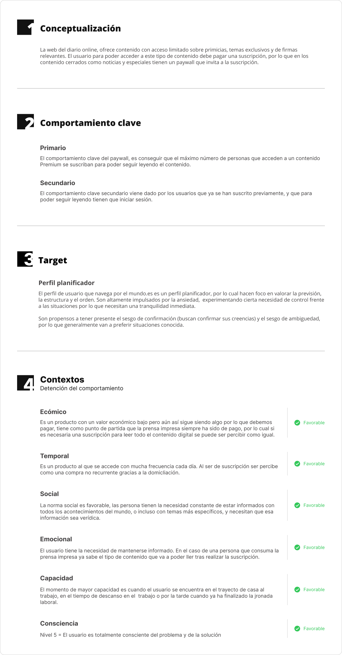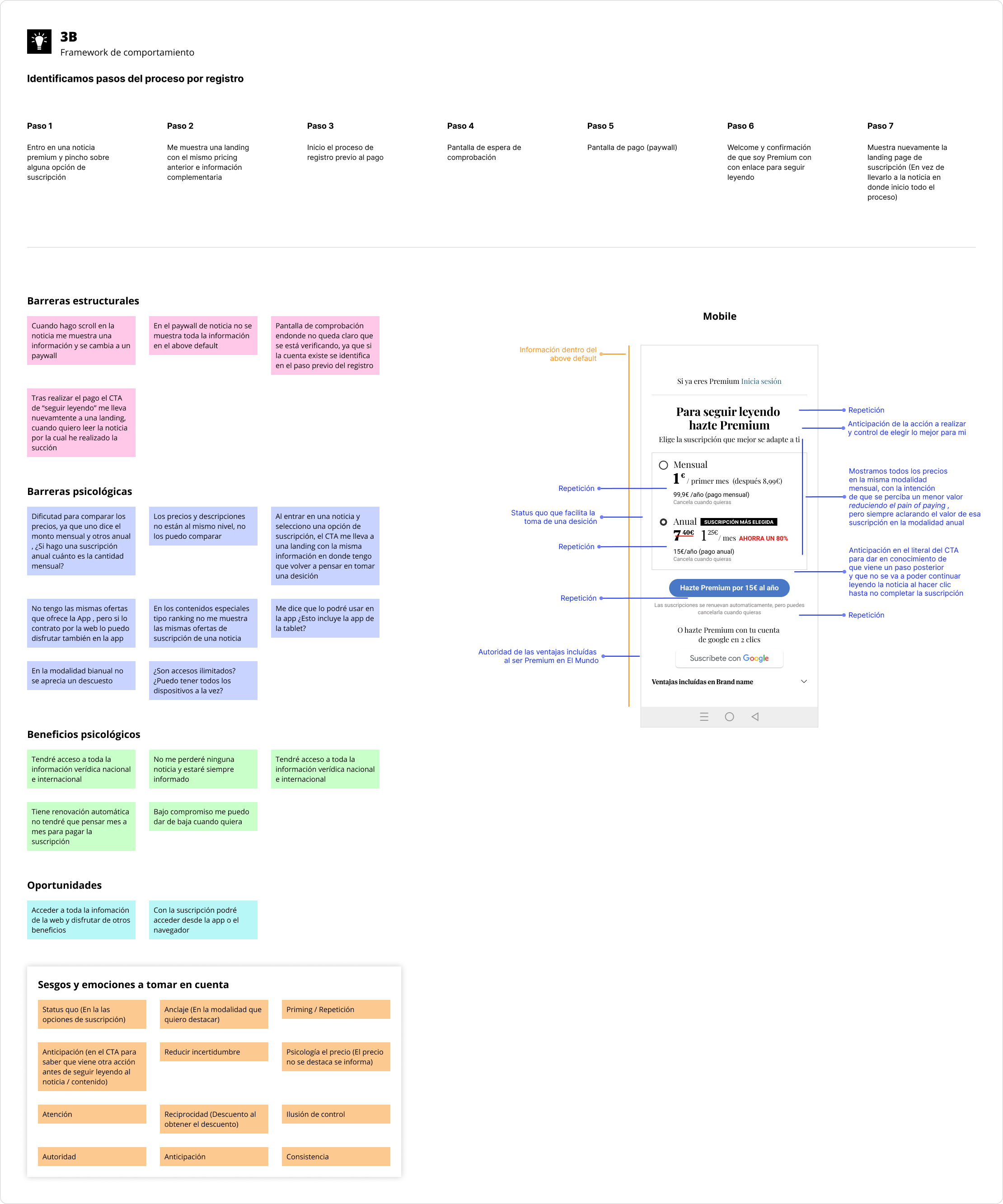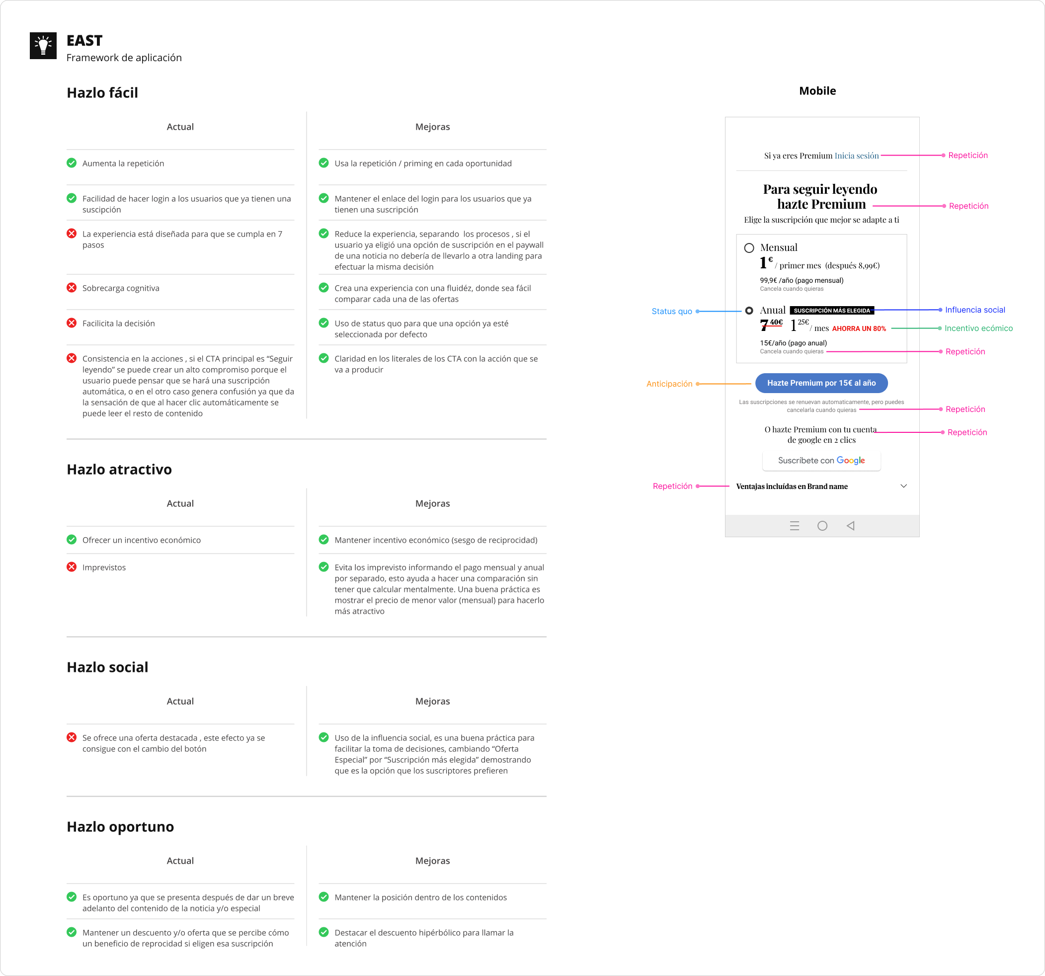 Para desarrollar el diseño del paywall, partimos de principios de la psicología cognitiva y la ciencia del comportamiento. Esto incluyó la conceptualización del producto digital, la identificación de comportamientos clave y la adaptación de contextos (cambiando el contexto se pueden influir las acciones). Además, se aplicaron dos frameworks: el modelo EAST para detectar comportamientos y el modelo 3B para derribar barreras.